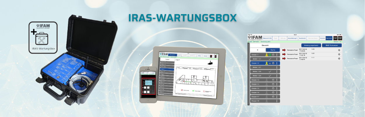 Die IRAS-Wartungsbox (I-WB) dient zur Unterstützung und Optimierung der Inspektion bzw. Wartung. Mit Hilfe der I-WB ist es möglich, die Ereignisse einer Prüfung in der Box abzuspeichern, zusätzliche Informationen zu hinterlegen, die gewonnenen Daten zu bearbeiten und zu versenden. Zusätzlich lassen sich Bedienvorgänge an der Brandmelderzentrale (BMZ) realisieren, sofern das Protokoll der BMZ dieses Leistungsmerkmal unterstützt. Diese Bedienvorgänge (Rückwirkungen auf die BMZ) erlauben Steuerungen wie z. B. Abschaltungen, die das Prüfen von Meldergruppen und Meldern im Objekt vereinfachen. Dabei wird der Status der BMZ, besonders im Hinblick auf „FEUER“, ständig überwacht und angezeigt. Die durch die Prüfungen erzeugten Daten können als Dokumente den Stand der Wartung visuell wiedergeben, um so eine Nachweisführung im Sinne der DIN 14675 zu gewährleisten.